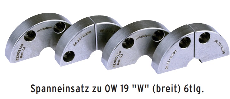 Система OW 19 — замкнена орбітальна зварювальна головка, призначена для труб із зовнішнім діаметром приблизно від 3 мм до 19,05 мм. Аксесуари до неї включають затискні вставки (clamping inserts) різних типів, які дозволяють точно фіксувати трубу в головці перед зварюванням. У комплект головки вставки не входять — їх потрібно замовляти окремо.