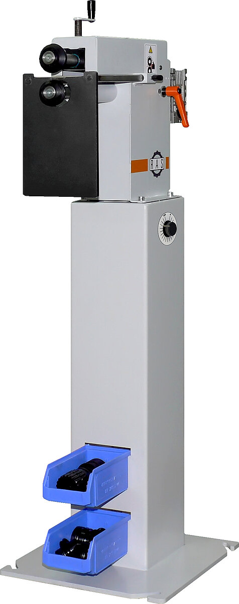 RAS 11.35 is a motorized universal beading machine designed for forming reinforcement ribs, flanges, and edge bending on sheet metal. This machine is intended for workshops and on-site installation work, combining a compact stand-mounted design with a motorized drive featuring infinitely variable speed control. It offers simple operation via a foot switch with reverse capability and includes a complete set of 9 pairs of working rollers in the standard delivery.