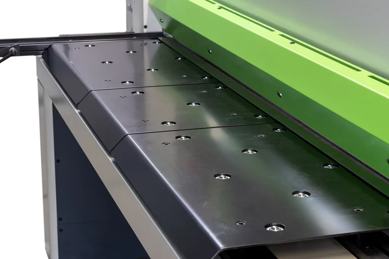 • Пневматичний утримуючий пристрій — балка, яка контролюється пневматично, забезпечує щільне притискання листа, що запобігає його підриву, “завихренням” або появі дефектів. Окрім цього, це важливо при роботі з м’якими або чутливими матеріалами.