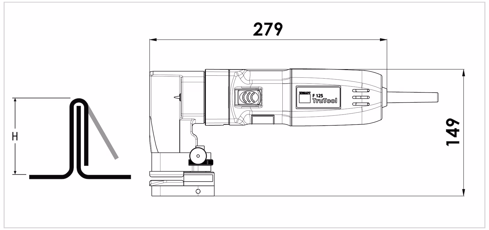 TRUMPF TruTool F 125 — це найлегший і найергономічніший електричний фальцезакривач у лінійці TRUMPF, спеціально призначений для швидкого та надійного закриття Кутових фальців (Angle seams) та Стоячих фальців (Standing seams) у повітроводах прямокутного перерізу та покрівлях. Інструмент працює за принципом пружинного молотка і є ідеальним рішенням для монтажних робіт завдяки своїй компактності та малій вазі (2.8 кг).