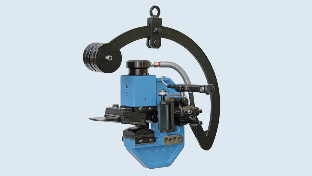 Eckold MKF 130/16 is a mobile hydraulic Kraftformer (powerful forming press) executed in a C-Frame format. It is designed to perform operations requiring significantly greater force than the MZ-pliers can provide. The MKF 130/16 is ideally suited for the precise flanging (beading), straightening (reforming), clinching, and stretching of thick metal sheets on large blanks (reservoirs, tanks, aerospace components) that cannot be moved to a stationary press.