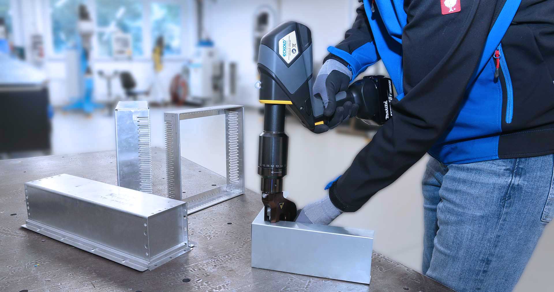 Using an electro-hydraulic drive and interchangeable clinching tools, the device provides a pressing force of up to 50 kN, allowing it to work with steel, aluminum, and other ductile metals up to 4 mm thick. This tool is particularly suitable for assembly and repair work, as well as for assembling metal structures, ventilation systems, control cabinets, and enclosures. High autonomy (up to 400 cycles per charge) and a swiveling head ensure maximum mobility on the production floor.