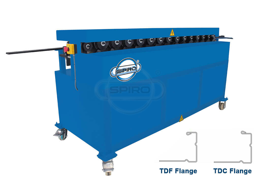 Spiro Rollforming machine TDC/F від Spiro International SA (Швейцарія) — це профілювальний верстат з 14 формувальними станціями, призначений для створення жорсткого фланця TDC або TDF безпосередньо з матеріалу стінки повітроводу. Фланці TDC/TDF є одним із найпоширеніших у світі стандартів для з’єднання прямокутних повітроводів, оскільки вони усувають необхідність у додаткових кутниках і забезпечують високу герметичність. Верстат є двостороннім (Dual sided) і може одночасно створювати фланець на одній стороні та з’єднувальні кліпси (clips) на другій.