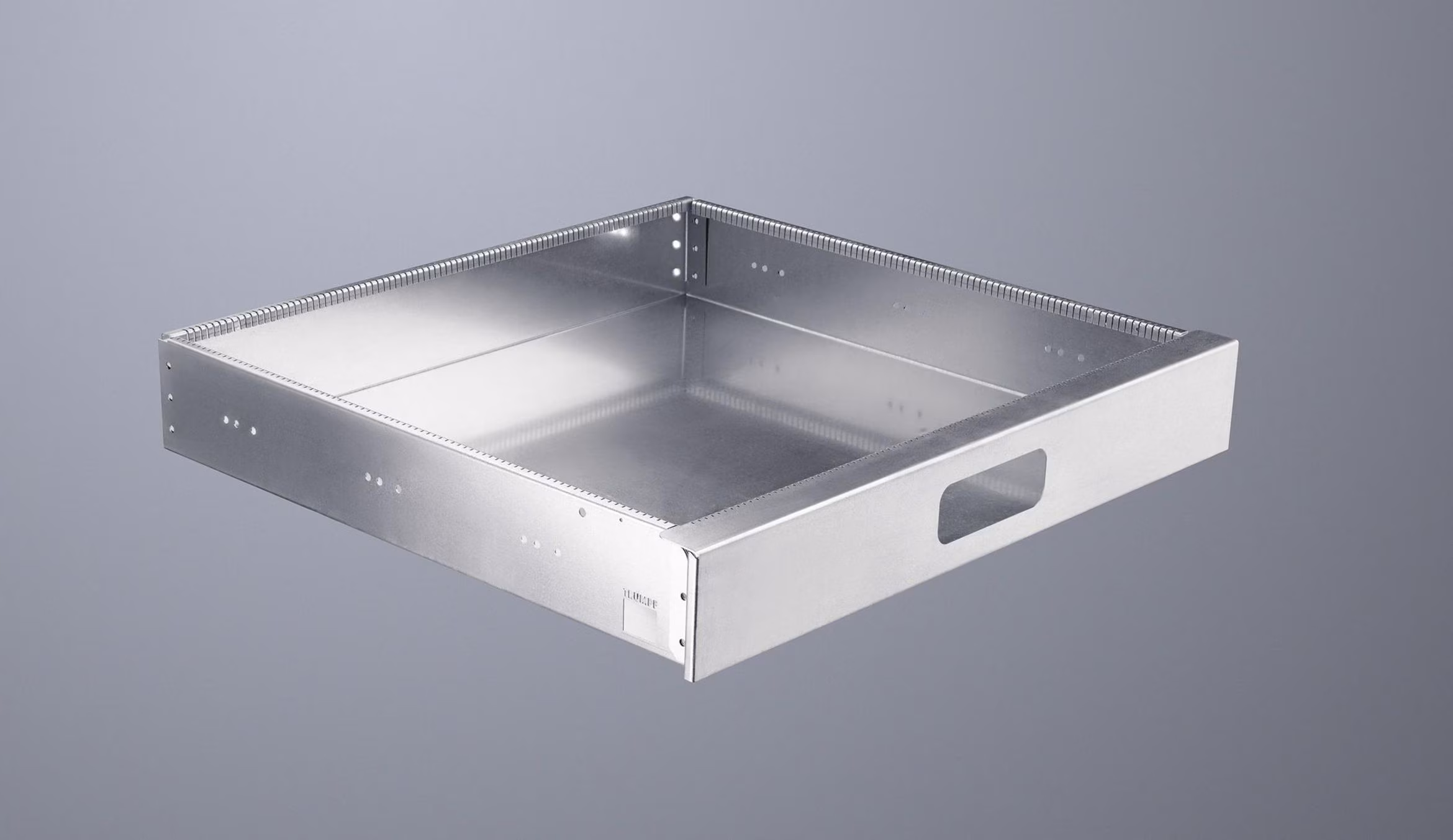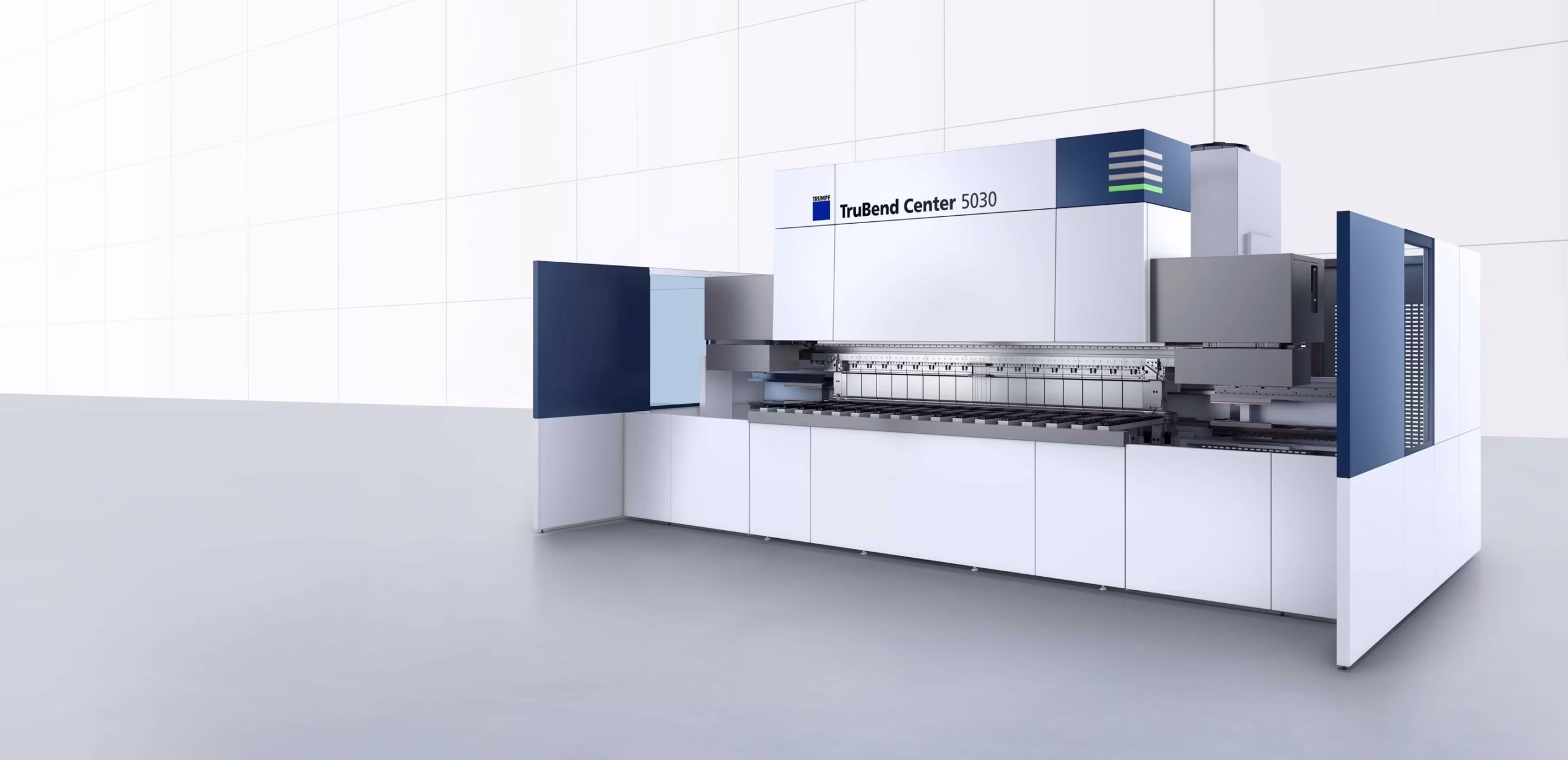 TRUMPF TruBend Center 5030 is a semi-automatic panel folding center that combines software control, extensive capabilities for complex geometric parts, and efficient tool change. The machine allows for the manufacturing of products ranging from thin decorative panels to boxes and bases with radii, internal bends, and reverse folds, all with high repeatability and accuracy. This center provides the capability to process a wider range of parts compared to a conventional press brake (or bending machine) — with less retooling, greater automation, and support for digital programming.
