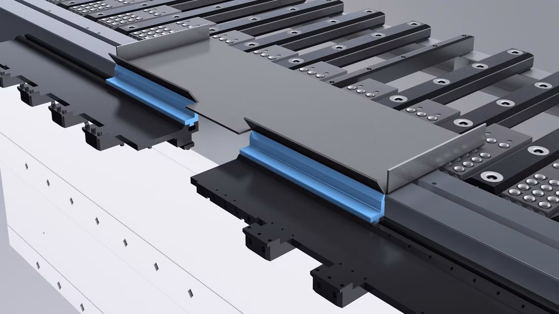 2-Axis Part Manipulator: Positions the sheet along two axes and has the necessary height to allow for reverse folds, as well as for parts with holes or radii. This enables folding "from below" without manually flipping or manipulating the part.